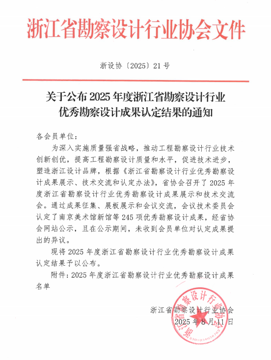 發布日期:2025.08.26 近日,2025年度浙江省勘察設計行業優秀勘察設計成果評選結果正式公布。由我院牽頭設計的“奉化江堤防整治工程鄞奉交界段”項目,繼榮獲寧波市優秀勘察設計獎之... -