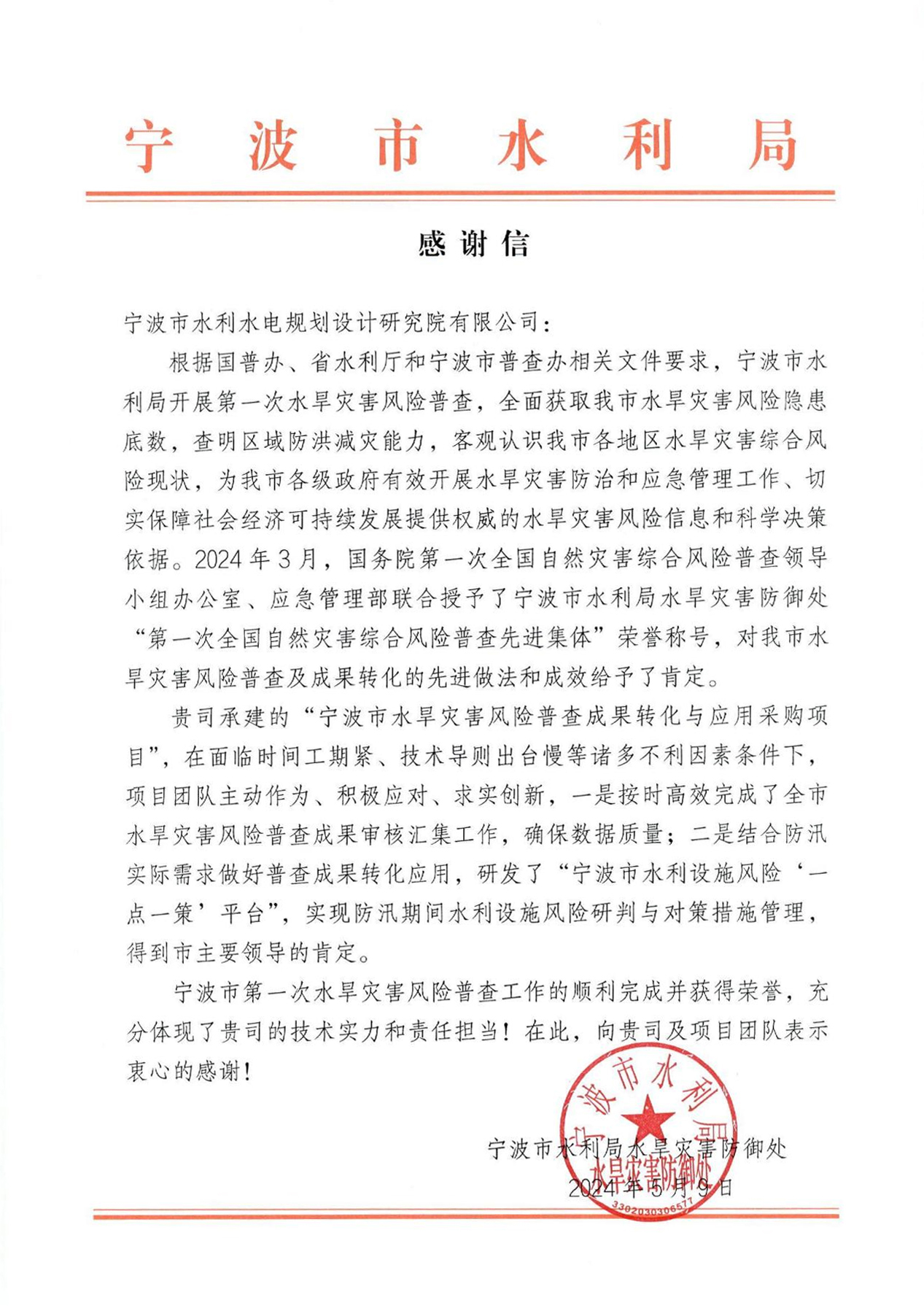 為寧波市水利院點贊——一封來自寧波市水利局水旱災害防御處的感謝信