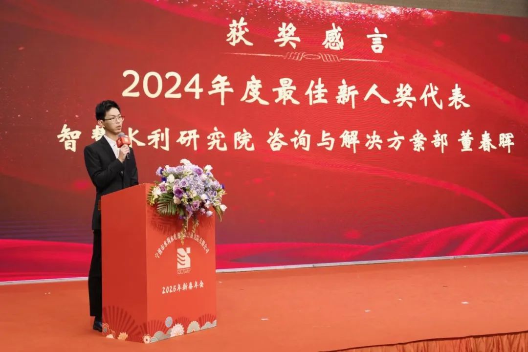 2024年度先進工作者獲獎代表工程院機電所的邵煜、2024年度最佳奉獻獎獲獎者綜合部的陳曉鳴、2024年度最佳新人獎獲獎代表智慧水利研究院咨詢與解決方案部的董春暉,先后上臺發表獲獎感言。