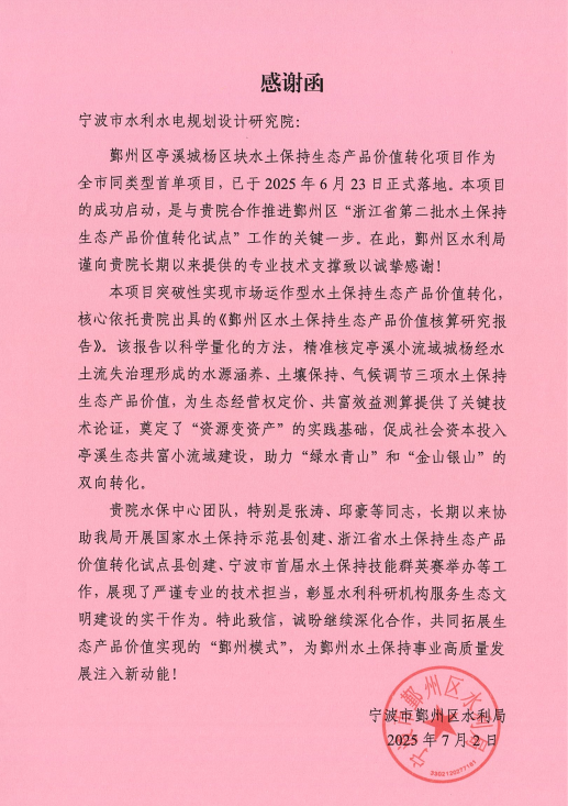 鄞州區水利局在感謝信中特別指出,我院提供的技術支持不僅專業高效,更體現了強烈的責任意識和服務意識。信中高度贊揚了水保中心團隊,特別是張濤、邱豪等同志,在相關工作中展現的嚴謹務實的工作作風、精益求精的專業態度,以及不辭辛勞的奉獻精神。這份肯定不僅是對項目組的褒獎,更是對我院全體職工莫大的鼓舞和激勵。