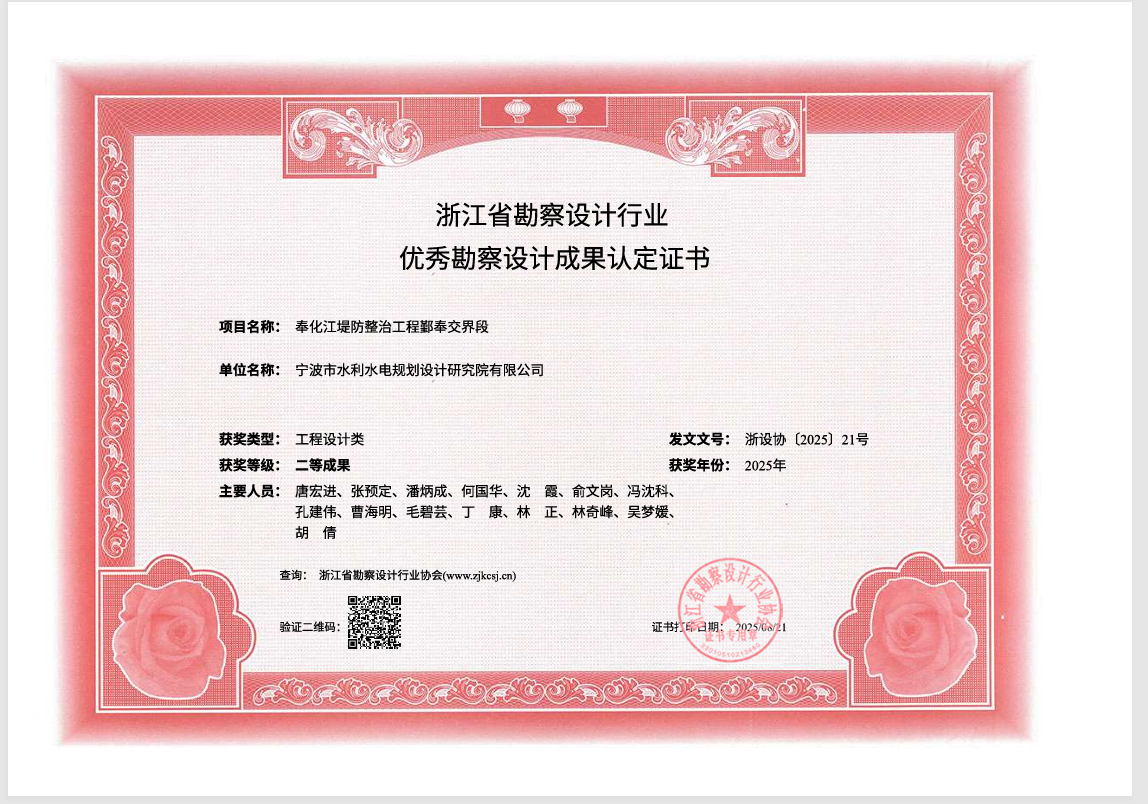 ●“奉化江堤防整治工程鄞奉交界段”獲浙江省勘察設計行業優秀勘察設計”二等獎