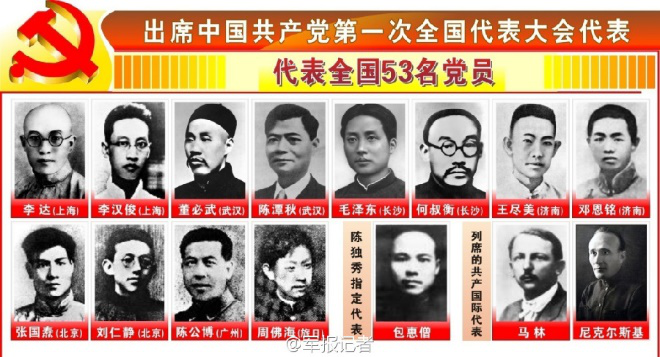7月23日晚,中國共產黨第一次全國代表大會在上海法租界望志路106號(今興業路76號)正式開幕。會址設在李書城、李漢俊兄弟住宅,大家圍坐在客廳長餐桌四周,室內沒有特別布置,陳設簡單,氣氛莊重。出席者有上海的李漢俊、李達;北京的張國燾、劉仁靜;長沙的毛澤東、何叔衡;武漢的董必武、陳潭秋;濟南的王盡美、鄧恩銘;廣州的陳公博;留日學生周佛海以及陳獨秀委派的包惠僧。陳獨秀和李大釗因公務在身未出席會議,而在代表們心目中他們仍是黨的主要創始人和領袖。
