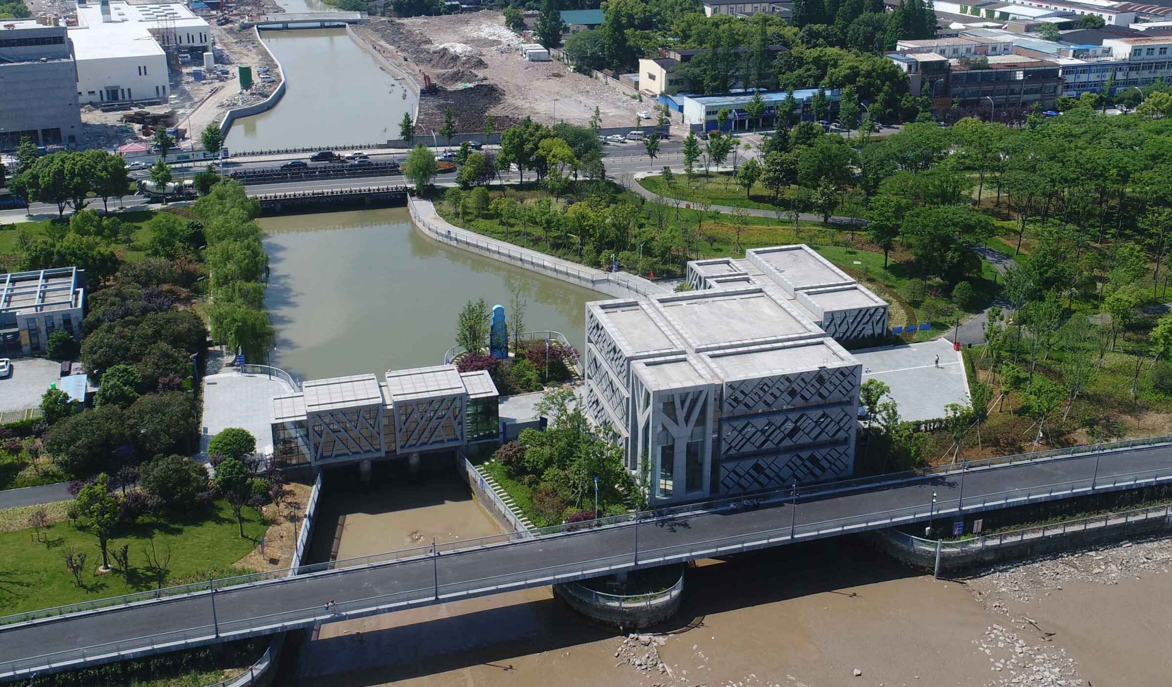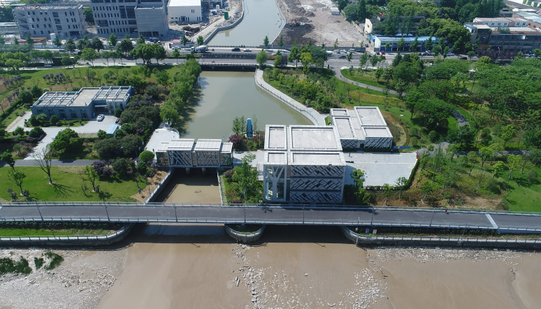 工程通過抽象手法,將樹、落葉等元素融入到建筑表情之中,從而閘站更像是沿江公園里面的雕塑,通過虛實的結構處理,弱化了高大廠房結構的厚重感。