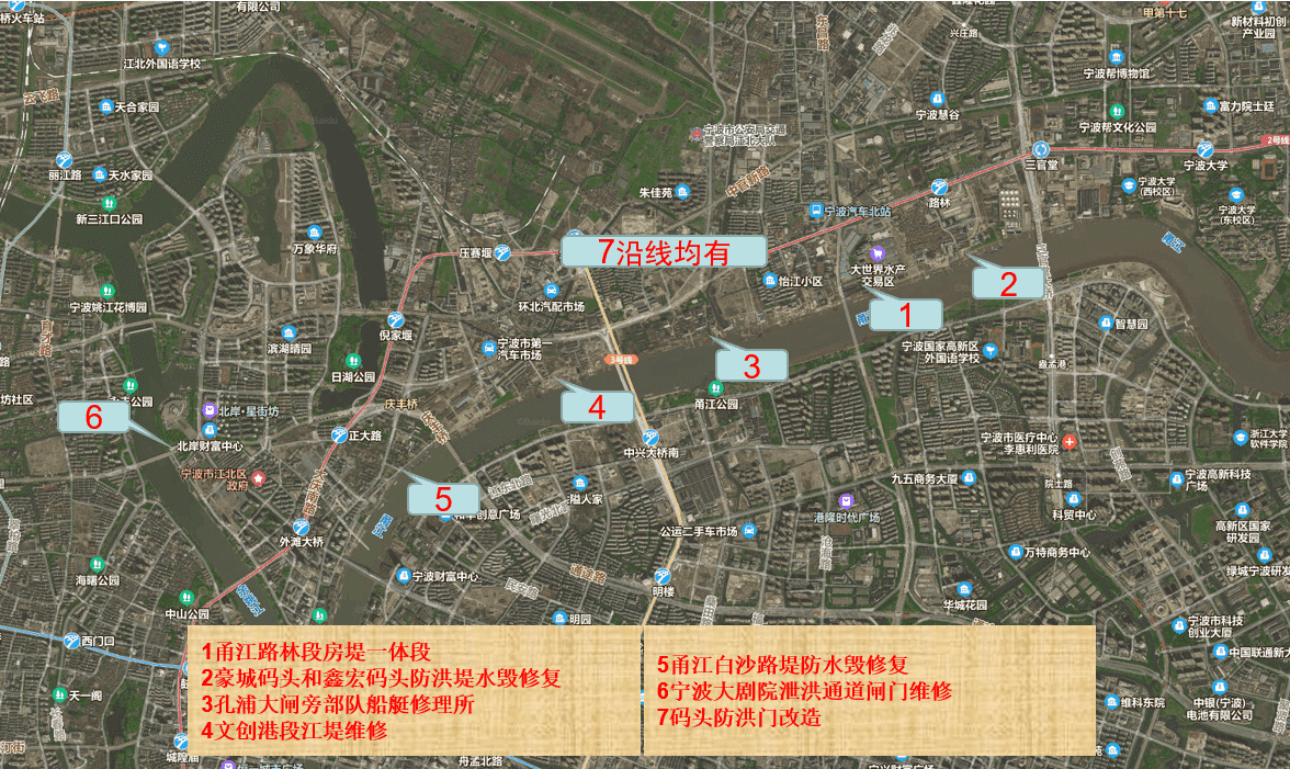 本次甬江姚江(環城北路以南)堤防水毀修復工程,旨在完善沿線堤防的破損點和薄弱點,對出現結構破損的堤段進行修復,對防洪標高暫不滿足或防洪尚未封閉堤段進行加高和封閉處理。