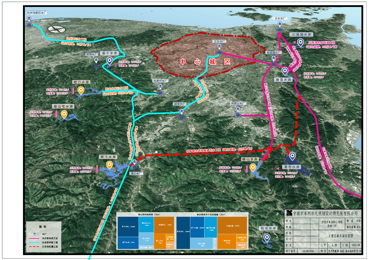 寧波市水庫群東西線聯(lián)通工程的測繪工作完成E級GPS控制點33個,特征高程點200個,三等水準測量約50公里;1:500地形測量約19.37平方公里,其中,陸域地形約17.61平方公里,水域地形約1.76平方公里;1:200水域橫斷面測量約3公里,1:500陸域縱斷面約4公里。