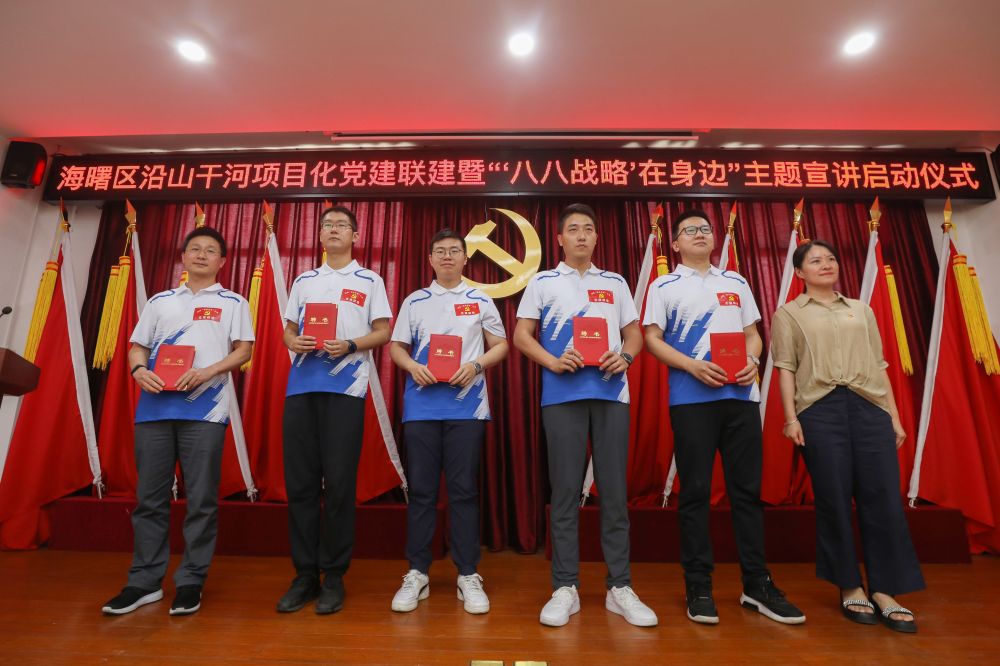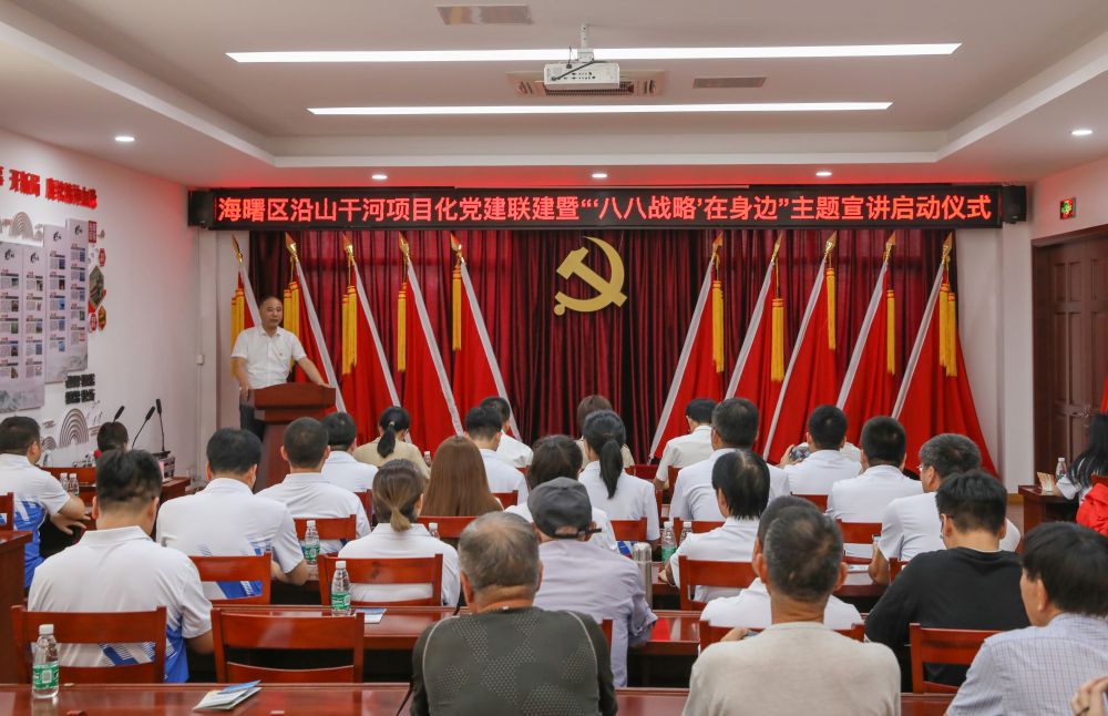 近日,海曙區直機關工委和區水利局以“五最黨建”為引領,在集士港鎮岳童村文化禮堂舉行沿山干河項目化黨建聯建暨“‘八八戰略’在身邊”主題宣講啟動儀式,我院作為沿山干河項目參建單位、活動的承辦方參與了啟動儀式。我院黨總支書記、副院長王洪霞,工程設計項目組及青年黨員代表十余人參加了上述活動。