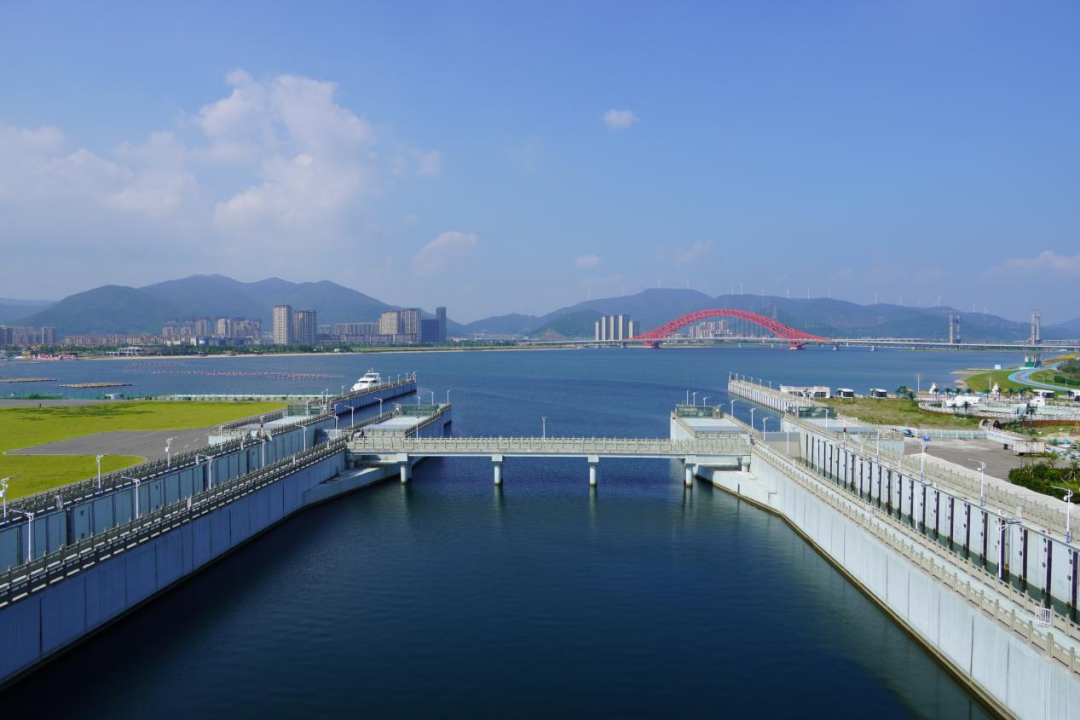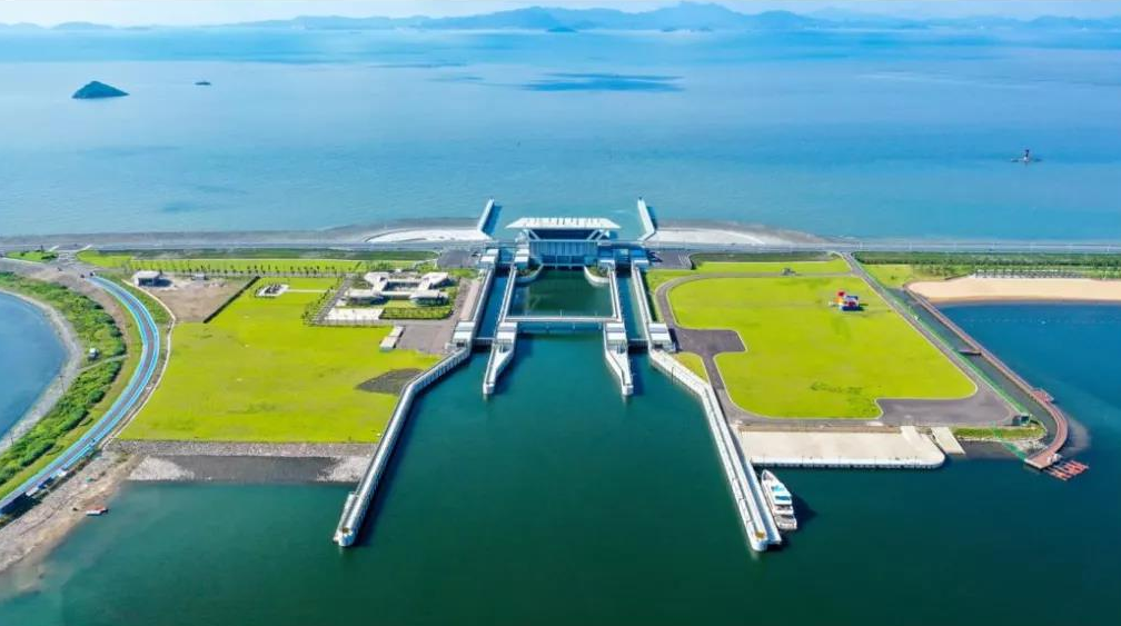 該工程位于北侖區梅山島與穿山半島西南部之間的梅山水道。工程東臨梅山保稅港區,西鄰北侖春曉濱海新城,北瀕白峰上陽片,南接象山港,工程區治理南北向總長11.5km,水面積 9.63km2,正常庫容約 5000萬m³。項目由海堤、南堤樞紐、北堤閘、泊船區、管理區等組成。