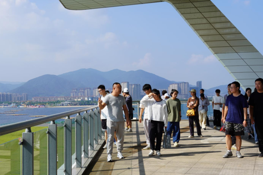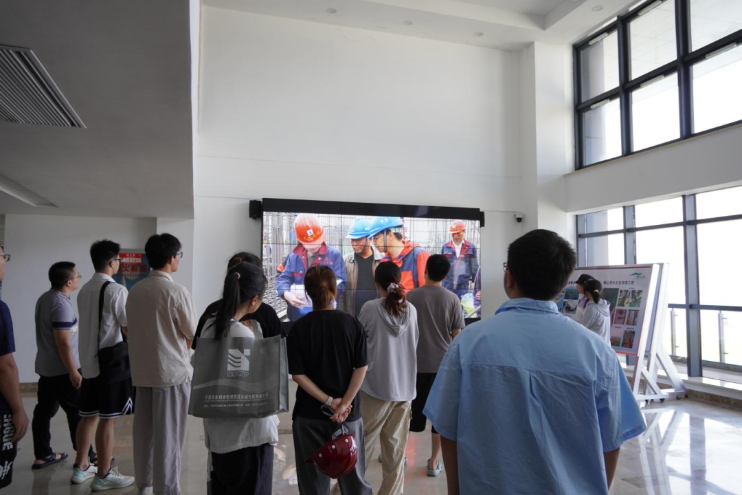 梅山灣外,銀浪拍岸;梅山灣內,碧波含翠。首先,研學隊伍到達梅山灣建設管理中心,跟隨工作人員登樓參觀,眺望南堤樞紐及附近設施,聆聽工程總體建設情況,并觀看宣傳片,了解該工程的誕生始末。