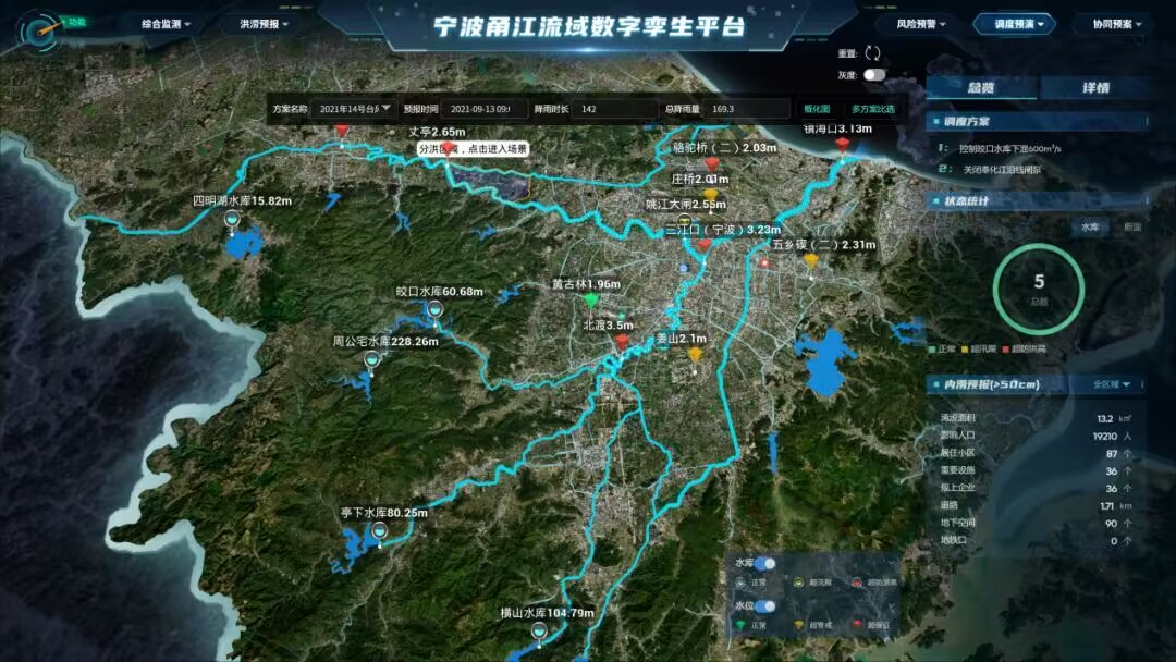 目前,基于寧波甬江流域數(shù)字孿生平臺打造的防洪應用已完成“綜合監(jiān)測、洪澇預報、風險預警、仿真預演、協(xié)同預案”5大功能板塊的開發(fā)和“三江堤防、沿海海塘、重點水庫、重要設施內澇”4個“四預”場景的應用。
