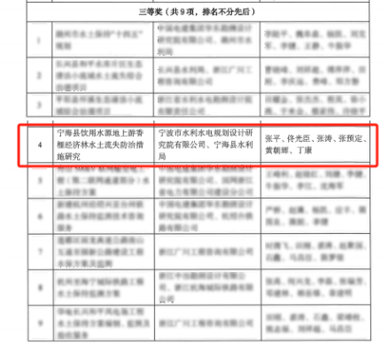 近日,浙江省水土保持學(xué)會(huì)第三屆優(yōu)秀設(shè)計(jì)評(píng)選獲獎(jiǎng)名單出爐,15個(gè)獲獎(jiǎng)工程中,我院成功鎖定一席!此次我院受寧海縣水利局委托開(kāi)展實(shí)施的寧海縣飲用水源地上游香榧經(jīng)濟(jì)林水土流失防治措施研究榮獲三等獎(jiǎng)。該獎(jiǎng)項(xiàng)由浙江省水土保持學(xué)會(huì)設(shè)立,每?jī)赡暝u(píng)審一次,通過(guò)對(duì)水土保持規(guī)劃設(shè)計(jì)領(lǐng)域中取得優(yōu)異成績(jī)的集體和個(gè)人進(jìn)行表彰,從而推動(dòng)全省水土保持行業(yè)的發(fā)展。