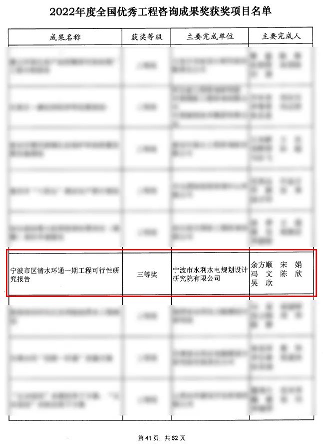 近日,中國工程咨詢協會公布2022年度全國優秀工程咨詢成果獎獲獎項目名單,寧波市水利院申報的《寧波市區清水環通一期工程可行性研究報告》咨詢成果順利通過公示,榮獲2022年度全國優秀工程咨詢成果三等獎!該獎項由中國咨詢工程協會組織申報評審,每兩年評選一次,是中國工程咨詢行業含金量最高的獎項。