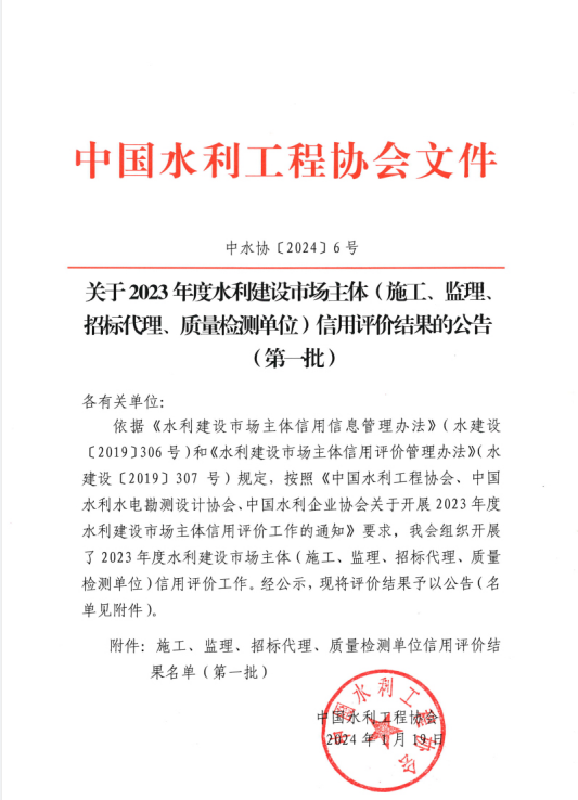 近日,中國水利工程協會《關于2023年度水利建設市場主體(施工、監理、招標代理、質量檢測單位)信用評價結果的公告(第一批)》(中水協〔2024〕6號)、中國水利水電勘測設計協會《關于2023年度水利建設市場主體(勘察、設計、咨詢單位)信用評價結果的公告》(中水協秘〔2024〕6號)、《關于2023年度全國水利水電勘測設計行業信用評價結果的公告》(中水協秘〔2024〕7號)發布。