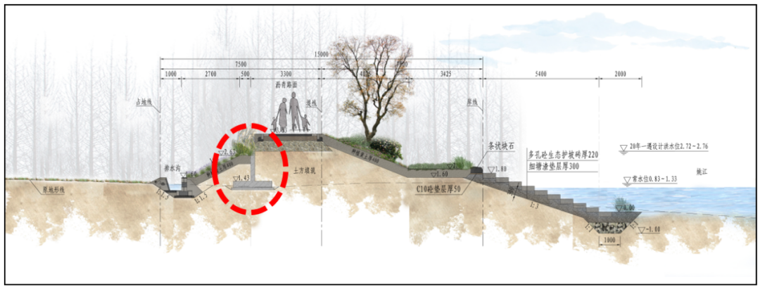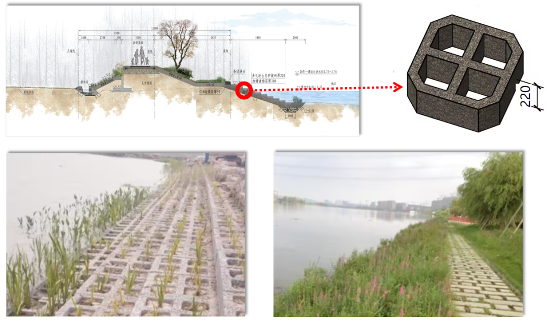為了保證水體交換同時防御土體掏刷,工程迎水側護坡采用多孔混凝土生態護坡磚,不僅防沖固土,也利于水生動植物生長,營造自然、生態的水岸環境。